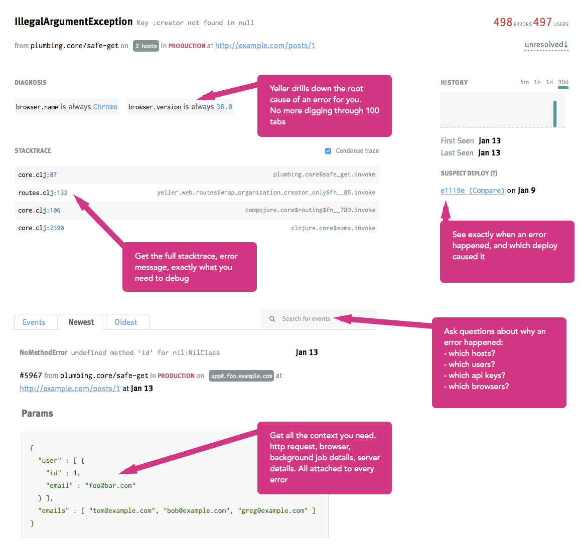 So, I built Yeller, which tracks your application's errors, and keeps you on top of them, not drowning in noise.