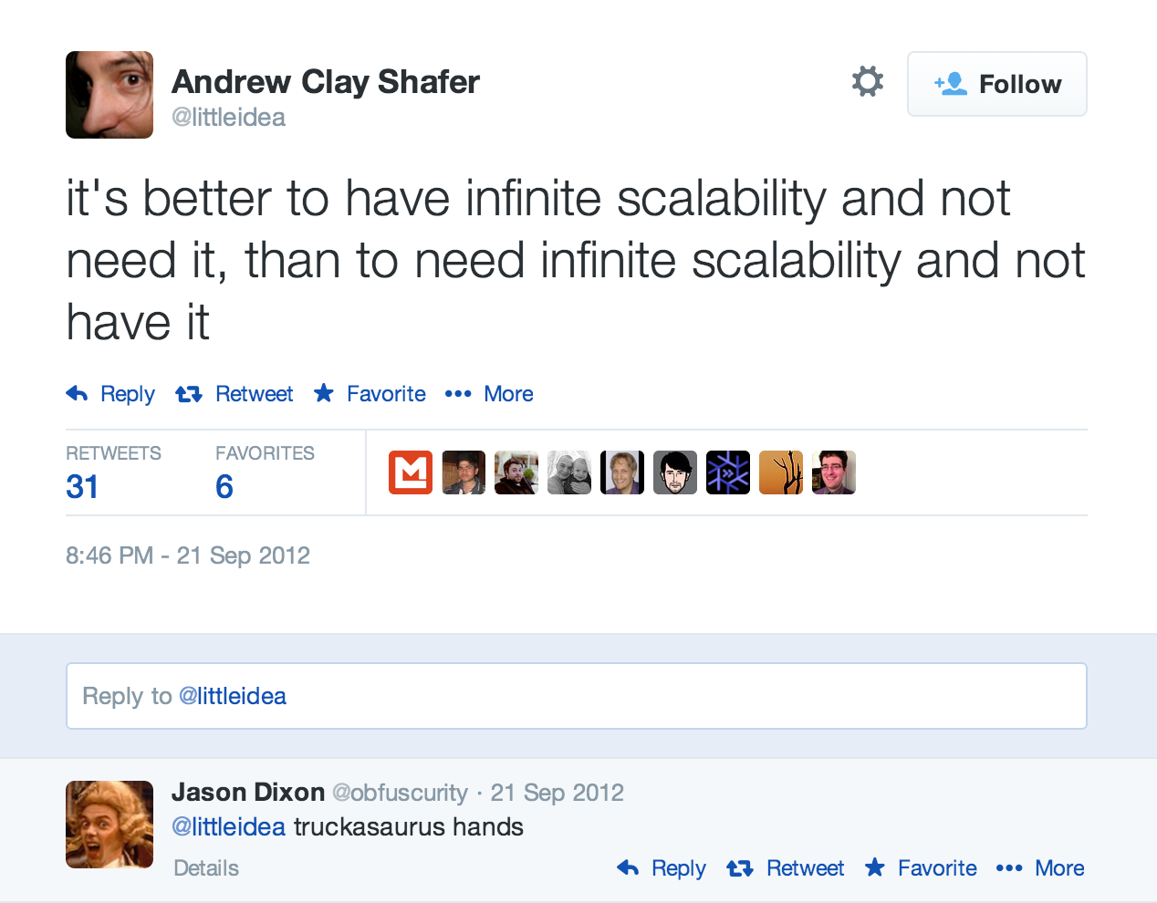 Feature Flags are very often implemented using redis - James Golick’s rollout is a great sample of this. However, using redis for feature flags means you’re neccesarrily bottlenecking your system on a single core in your cluster (or you’re operating clustered redis, which can work, but uh, I don’t want to do it). One of the things I truly believe in for Yeller, is this tweet, by @littleidea: