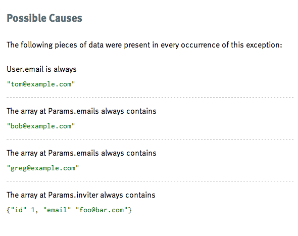 Each piece of data that’s unique across all occurrences is called out as a possible cause. If you’ve ever wondered “is the root cause of this just this one specific parameter?”, then this feature is for you.